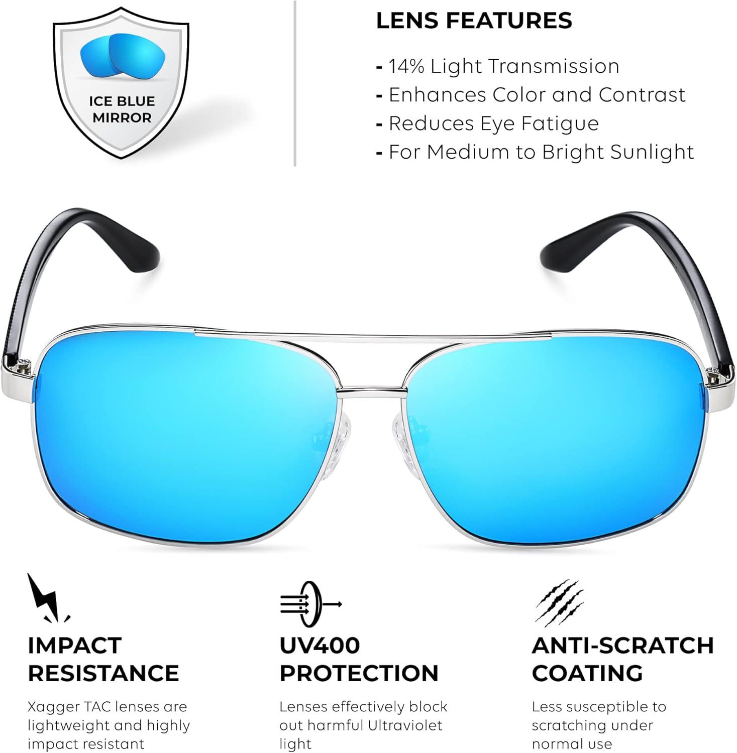 Xagger Polarized Brow Bar Square Aviator Sunglasses for Men Retro Pilot Military Style Driving Shades UV400(Silver – Black Temples | Ice Blue Mirror)